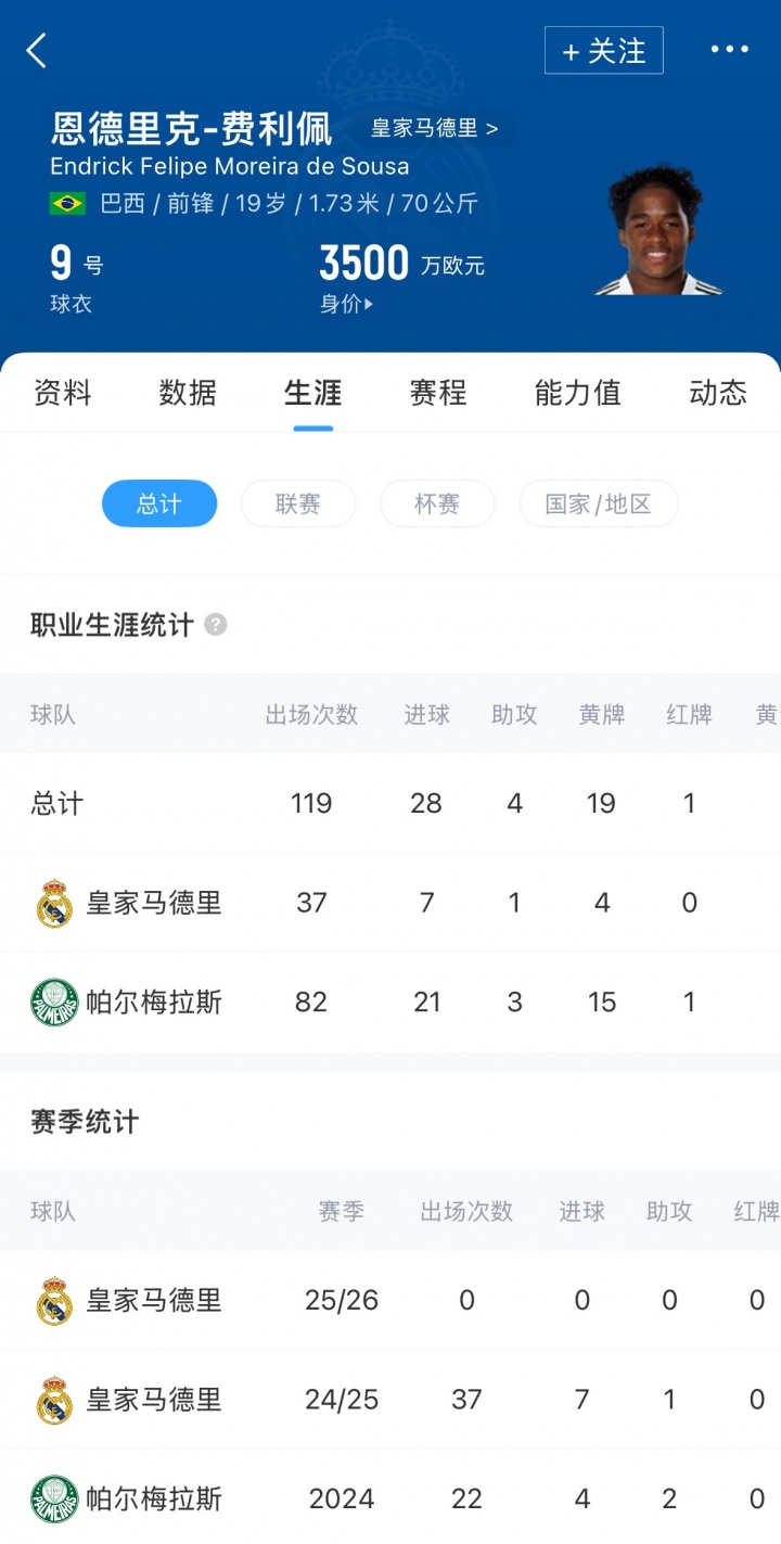 即使是對(duì)陣萊萬(wàn)特和凱拉特的比賽,恩德里克仍坐在替補(bǔ)席,即便球隊(duì)有巨大領(lǐng)先優(yōu)勢(shì),他甚至都沒(méi)有獲得熱身機(jī)會(huì)。恩德里克夢(mèng)想著跟隨巴西參加2026世界杯,但缺乏出場(chǎng)時(shí)間可能會(huì)讓他與國(guó)家隊(duì)大名單漸行漸遠(yuǎn)。最近一期巴西隊(duì)名單,恩德里克則再次落選。