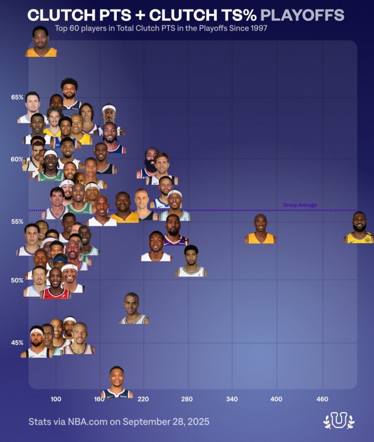 9月29日訊 近日,數(shù)據(jù)媒體NBA University總結(jié)了自從1997年以來(NBA官網(wǎng)該項(xiàng)數(shù)據(jù)統(tǒng)計(jì)起始時(shí)間)在NBA季后賽中關(guān)鍵得分前60球員的真實(shí)命中率分布圖表。