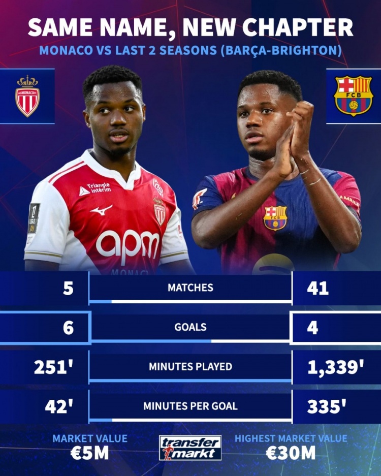 10月7日訊 法蒂今夏從巴薩租借加盟摩納哥,德國轉會市場統(tǒng)計了法蒂過去兩個賽季在巴薩、布萊頓的數(shù)據(jù),以及本賽季在摩納哥的數(shù)據(jù),做出對比。
