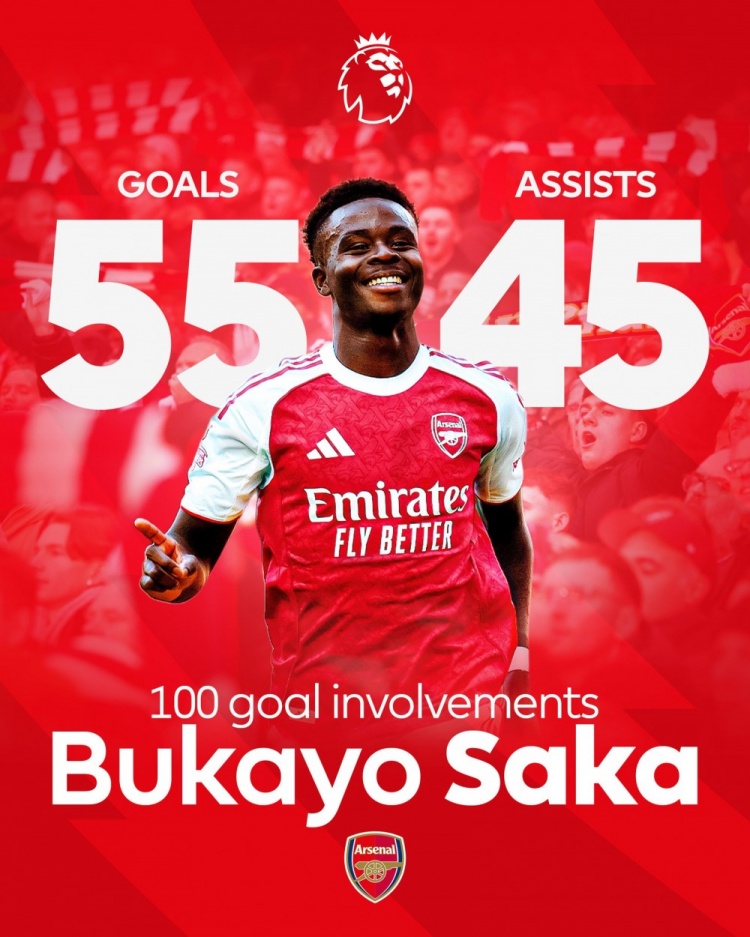 英超官方社媒曬海報向薩卡表示祝賀,并配文寫道:薩卡在英超聯(lián)賽中參與進(jìn)球數(shù)突破100個