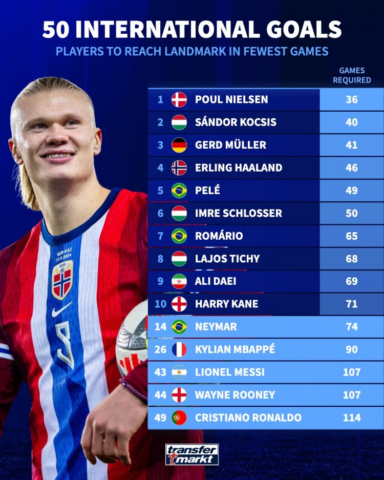 10月13日訊 在上周對陣以色列的世預賽中,哈蘭德上演帽子戲法,這讓他成為歷史上第4快打入國家隊第50球的球員。作為對比,梅西用了107場才達到這一里程碑,而C羅則用了114場。德轉列出了達成國家隊50球所用場次最少的球員?。