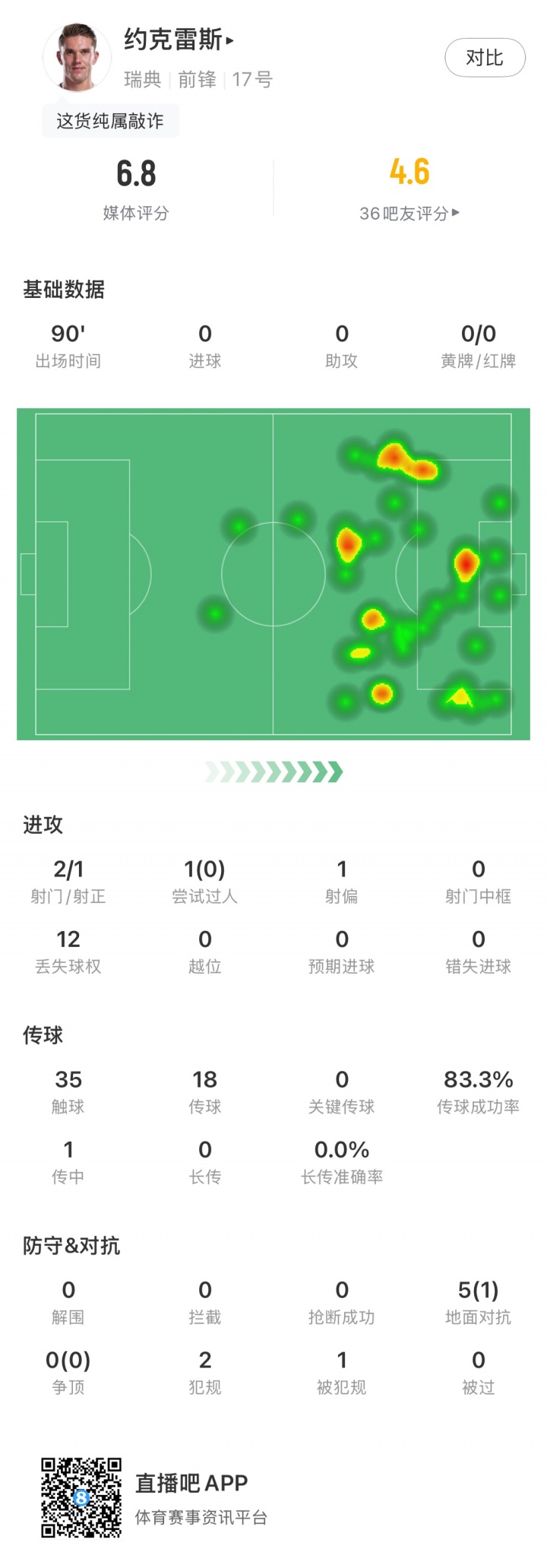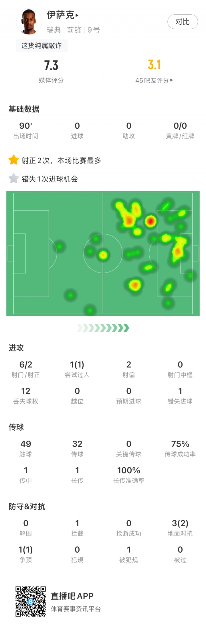 本場約克雷斯、伊薩克均首發(fā)打滿全場,伊薩克全場6射2正0球,1次錯失良機。約克雷斯數(shù)據(jù)為2射1正0球。